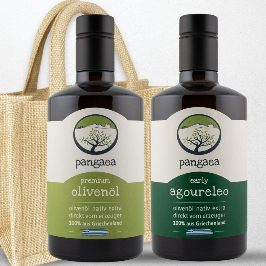Zwei Flaschen Pangaea Olivenöl in einer schönen Jutetasche!